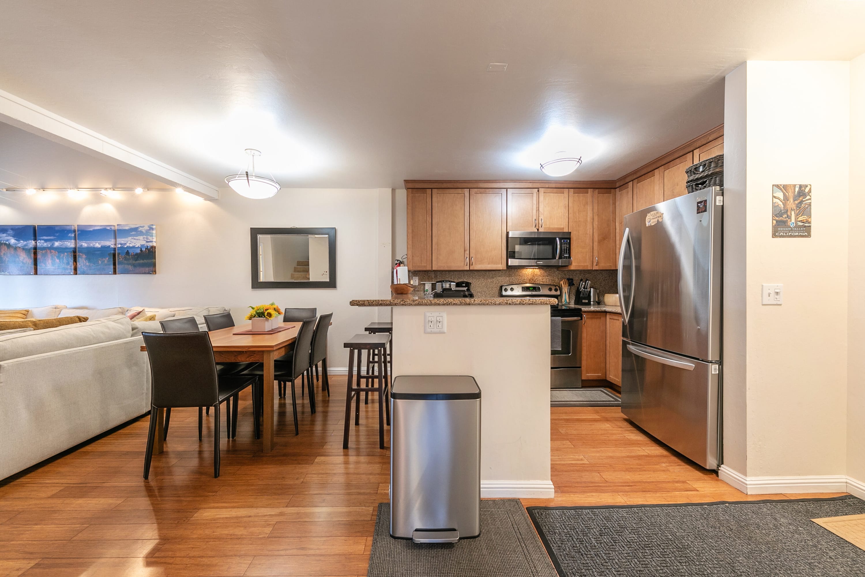 Location perks: Alpine Base Area at Palisades Tahoe (0.7 miles), Palisades Tahoe (6.8 miles), Tahoe City (7.3 miles), Commons Beach (7.6 miles) Interior: -Well equipped kitchen -6 person dining table -2 Smart TVs -Pellet stove -Board games -Washer and dryer -High speed Wi-Fi Exterior: -2 balconies -Serene forest surroundings -Garage parking for 1 mid-size SUV car. Outside parking is easy. Main Floor: kitchen, dining room, living room, 2 bedrooms, 1 en-suite bath, 1 shared full bath w/washer and dryer For those looking for an inviting alpine escape, this bright condo is perfect for you! The home welcomes you with a fully equipped kitchen just steps from the front door. The kitchen features everything you need to prepare home-cooked meals, with a kitchen bar and 3 barstools, and a 6-person dining table offering ample space to gather for meals with your group. The bright living room is ready for entertaining or relaxing with a plush L-shaped couch, a Smart TV, and a range of board games to enjoy. Have a group movie night while you warm up by the pellet stove, or step out onto the balcony and take in the fresh mountain air. The home includes 2 bedrooms and 2 bathrooms. The first room includes a twin over full bunk bed with a trundle that sleeps 3- 4 people. The second room has a queen bed and an en-suite bath. The 2nd bathroom includes a shower and a washer and dryer. STR Permit Number: STR22-6233 Max Occupancy: 5 Parking Info: Parking is available on the property. There is 1 space in the garage for a small sized SUV, and parking is available in outdoor parking lot next to the building.