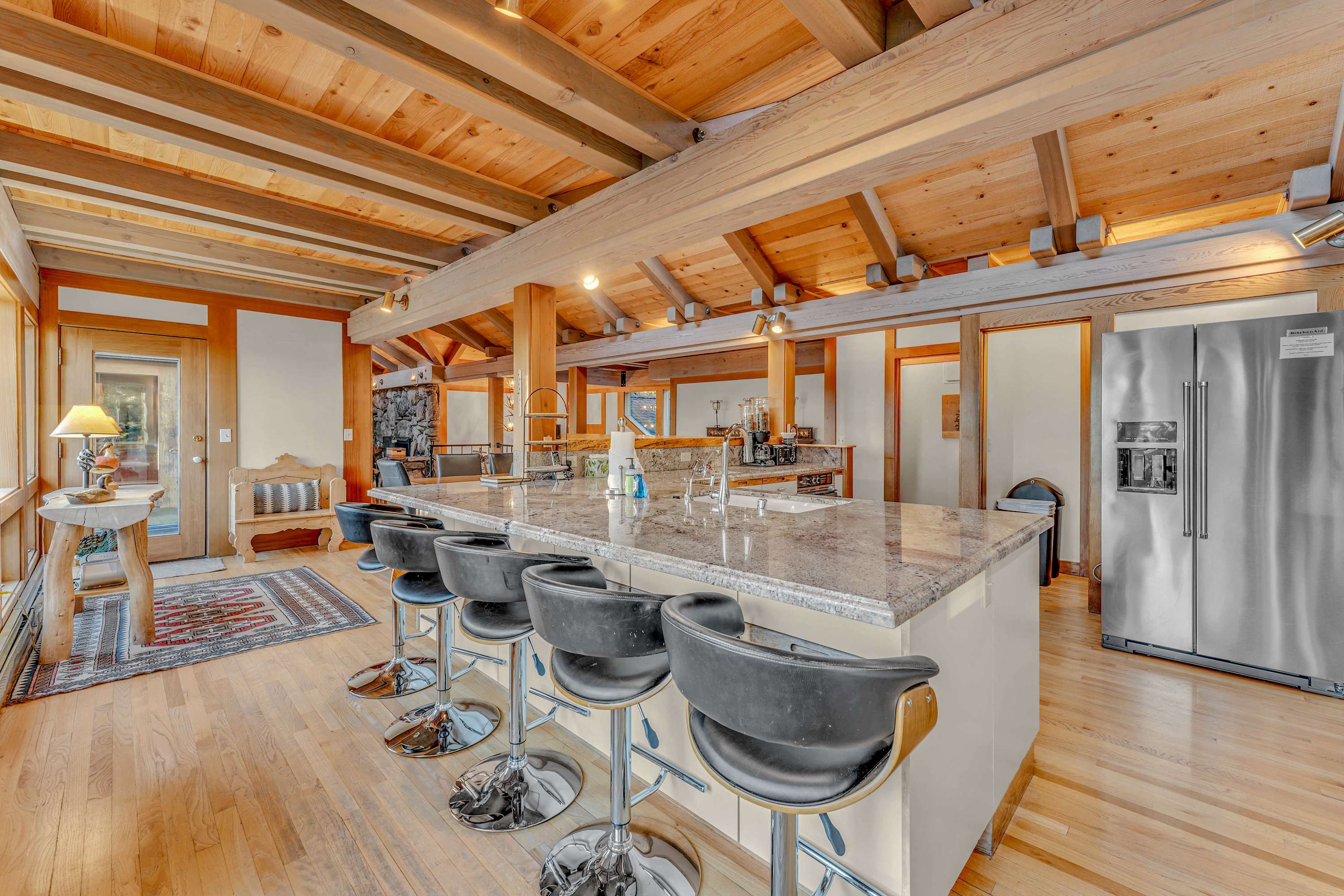 Location perks: Skylandia Park (1.4 miles), Tahoe Cross Country Club (1.7 miles), Tahoe City (2.6 miles), Alpine Base Area at Palisades Tahoe (9.8 miles), Northstar Ski Resort (13.7 miles) Interior: - Kitchen (drip coffee maker, Crockpot, waffle maker, toaster, cooking utensils, tableware) - 3 Smart TVs (55” in the living room) - 2 gas fireplaces (1 in downstairs game room, 1 in the master bedroom) - Wood-burning fireplace (in living room, off limits to guests) - Pool table - Full-size washer and dryer - Free WiFi - Radiant heating, no A/C - 4,610 sq. ft. Exterior: - 6 side decks - Dining area - Seating - On-site parking for 4 vehicles (2 in garage, 2 in driveway) Upper Floor: Kitchen, dining room, living room, half bathroom Ground Floor: 3 bedrooms, 2 en-suite bathrooms, 1 bathroom Basement: 2 bedrooms, 1 en-suite bathroom, 2 bathrooms, bonus room Situated just minutes from the lake, this impressive Tahoe City vacation rental spans 3 levels of spacious, stylish living designed for large groups or families seeking both luxury and comfort. The main floor’s open layout invites guests to unwind on 5 plush couches in the living room, which is equipped with a 55” Smart TV and provides access to 2 decks for enjoying scenic views. A gourmet kitchen, complete with a drip coffee maker, Crockpot, and waffle maker, flows seamlessly into the dining area, where a 10-person table sets the stage for memorable meals. For added fun, the ground-floor bonus room includes a pool table, wall bed, and additional seating—ideal for entertaining or accommodating guests. Bedrooms are thoughtfully arranged across the home’s 3 levels, ensuring privacy and relaxation. The standout master suite on the middle floor features a king bed, gas fireplace, private workspace, Smart TV, and 2 exclusive decks for quiet mornings or evenings. The en-suite master bathroom offers a touch of luxury, featuring a soaking tub, walk-in shower, and double vanity. Also on the middle floor are 2 additional bedrooms, one with a king bed and en-suite bathroom, and another with 2 twin beds and ample storage in dual dressers. On the basement level, you’ll find 2 more bedrooms. The first provides another king bed and en-suite bathroom, while the second bedroom is set up as a bunk room with 3 twin-over-twin bunk beds, perfect for kids or additional guests. With 6.5 bathrooms total—including en-suites and shared options on each floor—every guest has convenient access to a bathroom, reducing wait times and maximizing comfort. STR Permit Number: STR22-5627 Max Occupancy: 12 Parking Info: There are 2 in the garage and 2 in the driveway.
