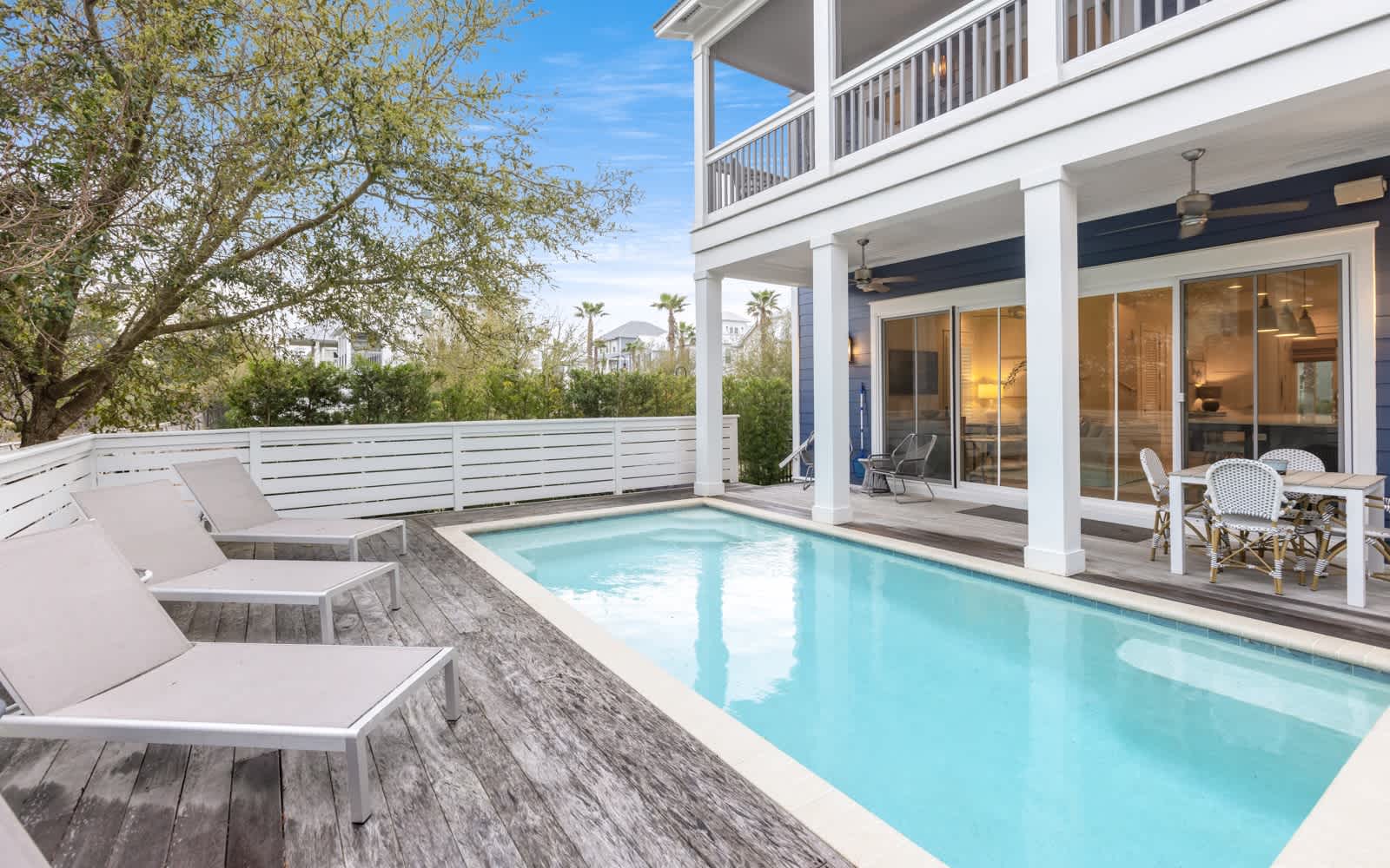 Location perks: Blue Mountain Beach Access (0.4 miles), Point Washington State Forest Trails (0.6 miles), Gulf Place Town Center (2.1 miles), Grayton Beach State Park (3.2 miles), Seaside (4.3 miles) Interior: — Kitchen (drip coffee maker, Keurig, blender, cooking utensils, tableware) — 5 Smart TVs with cable — Central heat and A/C — In-unit washer and dryer — Free WiFi — 2 living rooms — 2,872 sq. ft. Exterior: — Gas grill — Private pool — Screened balcony with seating — Outdoor dining area (seats 12) — Bike rack — Outdoor shower — On-site parking for 2 cars (driveway only) First Floor: Kitchen, dining area, living room, half bathroom Second floor: 2 bedrooms (king beds), 2 en-suite bathrooms, Third Floor: 1 bunk room ( 4 full-sized beds (2 sets of bunk beds)., 1 full bathroom, 1 Living Room, 1 bedroom (king bed), 1 en-suite bathroom, Local rental license number: