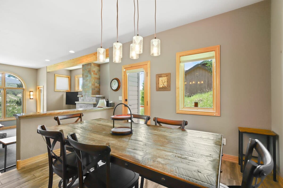 This incredible home strikes the perfect balance between work and play. Perfectly situated for just about any mountain adventure you can imagine, it also features everything you need to tackle remote work before hitting the slope or trails. Enjoy world class fly fishing on the Blue River as well as in the many nearby lakes and ponds, make the short, 10-minute drive to Lake Dillon and see a show at the Dillon Amphitheater or take in the scenic marina and, come winter, find yourself perfectly situated to hit the slopes at six different ski resorts. From the moment you enter, you will be greeted in classic Colorado style with a replica of the iconic “Welcome to Colorado” sign hanging in the entryway. Make use of the convenient bench, boot tray and coat hooks that await here, unload your gear and make your way upstairs to the beautiful, open-concept living, kitchen and dining area. Once upstairs, you will find yourself in the spacious living room, which boasts wood beam accents, luxurious leather furniture and abundant natural light. Settle into one of the two leather couches or the roomy leather armchair with an ottoman, switch on the lamps for some soft lighting and prepare to relax in front of the striking, stone fireplace or large flat-screen TV. A blanket basket nearby provides an opportunity for added coziness while end tables and a coffee table placed throughout the room make it easy to sip on a drink while you unwind. Steps away, a large dining table with seating for six awaits as an ideal space for digging into a meal, setting up a game or tackling a puzzle. It’s also perfectly located off of the kitchen, living room and the fabulous outdoor deck, which features a propane BBQ grill, two patio chairs and a patio dining table with seating for four with gorgeous views. Back inside, the dining table is adjacent to the lovely kitchen, which provides seating for three more at the bar. Full of high-end finishes, the stunning kitchen boasts stainless steel appliances, granite countertops and abundant cabinet space. Stocked with everything you need to whip up a meal, prepare a favorite recipe and make yourself at home, including a blender, toaster, tea kettle and coffee maker. The close proximity between the kitchen and dining room makes it easy to take meals from stove to table while the open layout keeps you central to it all whether grabbing a snack or crafting your latest culinary creation. A convenient half, powder bathroom is also located on this floor at the top of the stairs from the entrance and just off of the living room. When you’re ready to tuck in for the evening, head upstairs where you will find the spacious master bedroom complete with a king-size bed, nightstands, lamps, dresser, a flat-screen TV and a desk space with a monitor. Catch up on work, tuck into the cozy bed and unwind while watching a favorite show - you can do it all in this dreamy space. An en suite bathroom features a roomy walk-in closet, jetted jacuzzi bathtub, a walk-in shower with a modern glass door and a dual-sink vanity. Next to the master suite, you will find a second gorgeous bedroom with a queen-size bed, nightstand, lamps, dresser and its own en suite bathroom. Bathed in natural light, you will love the tranquil views from this restful space, while the attached bathroom boasts a single-sink vanity, a shower/tub combo and its own walk-in closet. Downstairs from the entrance, the ground floor can also be accessed from the garage. Here you will find more hooks and another boot tray for unloading your coats and outdoor gear as well as a dedicated laundry closet with a front-loading washer and dryer. A third bedroom found on this floor makes the most of its space with an efficient, XL twin-over-queen bunk bed, nightstand and lamp. It is next door to a third, full bathroom with a single-sink vanity and a shower/tub combo that is conveniently located for easy access from both the bedroom and as you enter the home from the garage. The garage has parking for one vehicle as well as ski racks and storage space for all of your outdoor gear. STR License Number: A65051413H