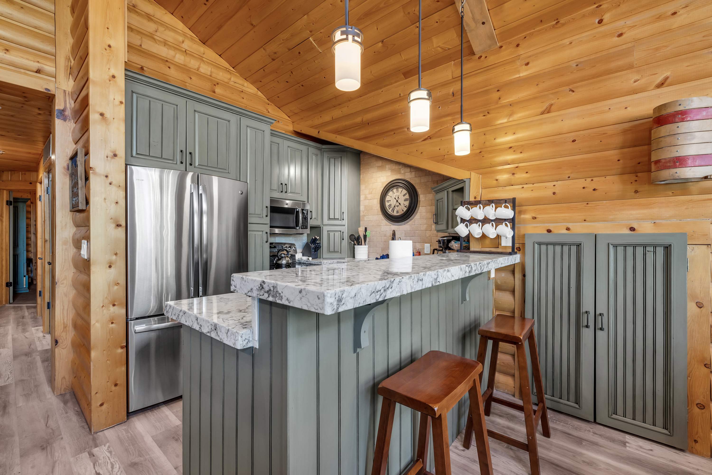 Location perks: Deer Valley Resort (0.2 miles), Historic Main Street (1.3 miles), Park City Mountain Resort (2.2 miles), Park City Golf Course (2.7 miles), Canyons Village (5.9 miles) Interior: -Well-equipped kitchen -4-person dining table -2 e-suite baths -Washer and dryer -Central heating, no A/C Exterior: -Private deck -Hot tub -Outdoor bistro table w/2 chairs -Serene forest surroundings -Gas BBQ Grill -On FREE shuttle line Main Floor: Kitchen, dining room, living room, 2 bedrooms, 2 en suite baths (1 en suite doubles as a shared bath) Enjoy a luxurious mountain escape at this 2-bedroom condo in the heart of Deer Valley, within walking distance of Deer Valley Resort. This 3rd-floor condo blends rustic charm with modern elegance, featuring log cabin decor with wood beams, stone accents, vaulted ceilings, and large windows showcasing serene views. The open-concept living space includes a welcoming living room with an impressive stone hearth, a couch that can be used as a pull-out full bed, and an HDTV, perfect for relaxing after a day of exploring. The high-end kitchen is outfitted with stainless steel appliances, spacious countertops, and a kitchen bar with 3 bar stools, adjacent to a dining area with seating for 4 under a deer antler chandelier. The main living space opens up to the spacious private balcony where you will find a bistro-style table with 2 chairs and a private hot tub, providing the perfect spot to unwind and enjoy the fresh mountain air. Down the hallway, you'll find the condo’s 2 bedrooms, each with comfortable king-size beds in log frames and en-suite bathrooms. The master bedroom includes ample storage space for your personal items and an en-suite bath with a spacious vanity and a bathtub/shower combo. The second bedroom features a tall dresser, a rocking chair, and an en-suite bath that doubles as the shared bathroom with dual access from the hallway and bedroom. The bathroom boasts a single-sink vanity and a spacious walk-in shower. The condo also includes a stacked washer and dryer for your convenience.