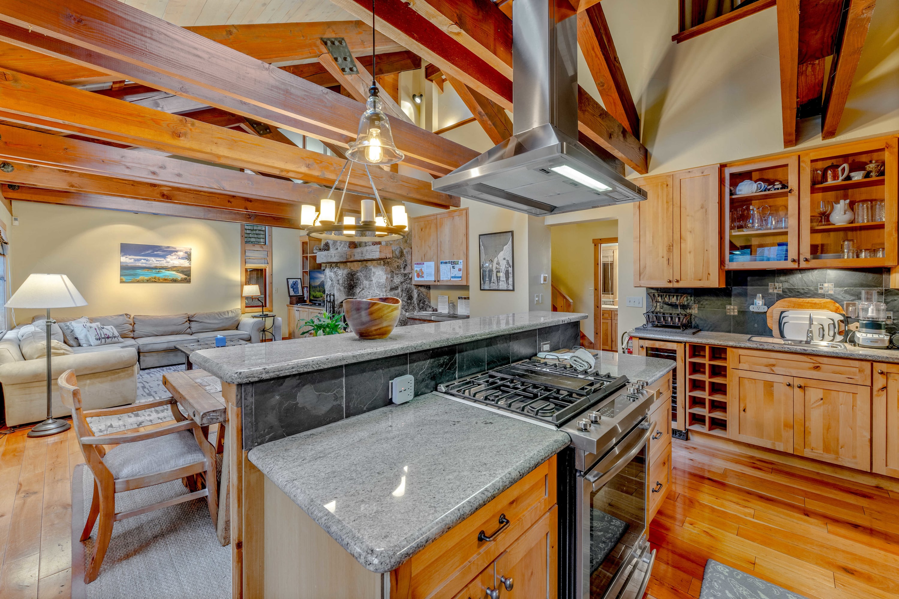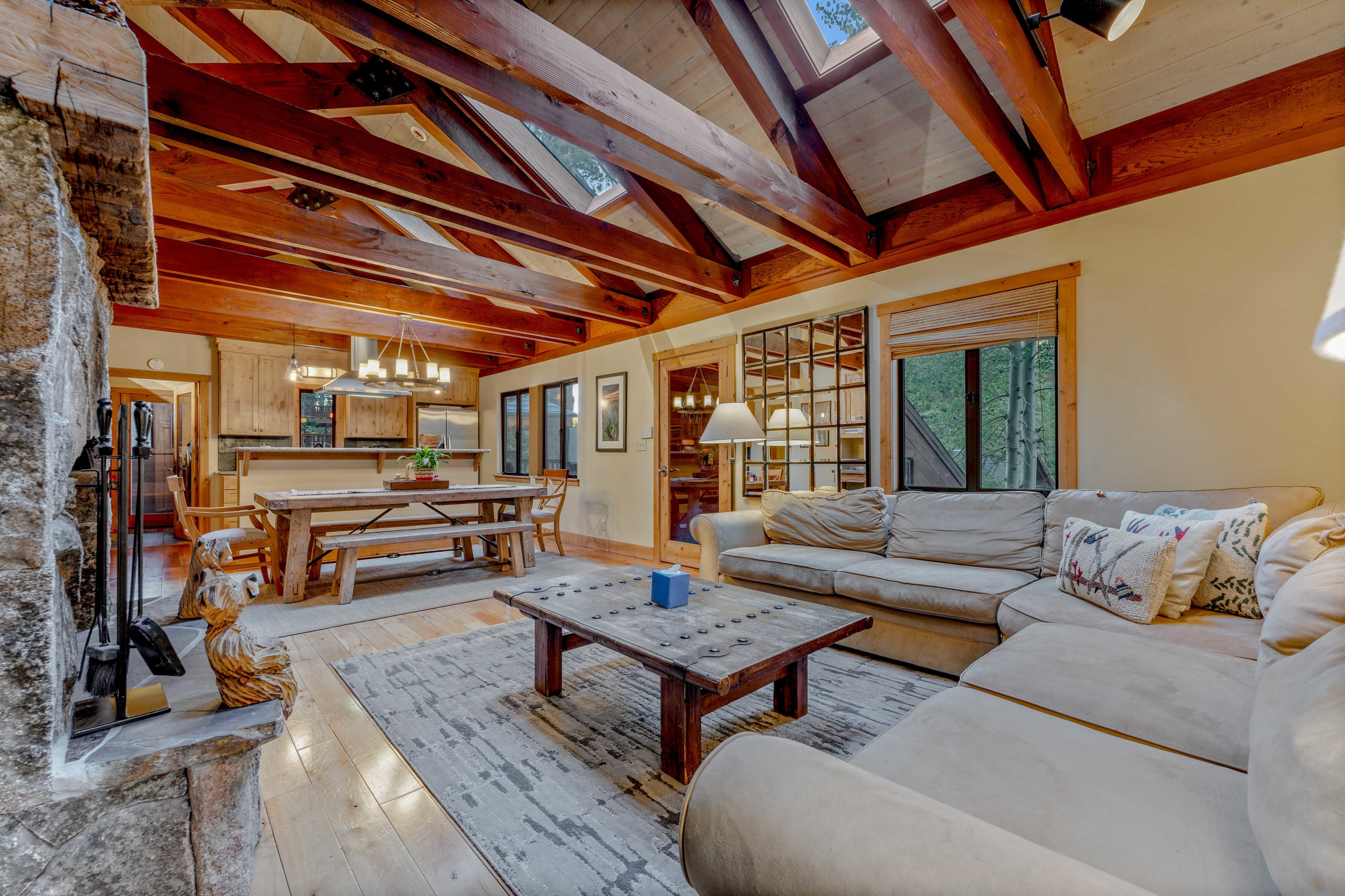 Location perks: Alpine Base Area at Palisades Tahoe (1.4 miles), The Village at Palisades Tahoe (5.8 miles), Tahoe City (6.0 miles), Commons Beach (6.2 miles), Northstar Resort (18.6 miles) Interior: - Well-equipped kitchen (drip coffee maker, crockpot, blender, air fryer) - 10-person dining table - Wood-burning fireplace - 2 TVs (46” in the living room) - Washer and dryer - Central heating, no A/C (portable fans in bedrooms) Exterior: - Deck - Outdoor dining & seating - 6-person hot tub - Gas BBQ - Serene forest surroundings - Free onsite parking for 4 cars Upper Level: 2 bedrooms, 1 full bath Main Level: Living room, kitchen, dining room, 2 bedrooms, 1 bath, 1 en-suite bath This beautiful home is filled with natural light and stylish cabin charm! This beautiful home, nestled in a peaceful setting, has everything you need for a memorable mountain escape. The open main living space features vaulted ceilings with exposed wood beams, skylights, and large windows that frame the forested setting. A wood-burning fireplace warms up chilly winter days as you relax on plush living room furniture and watch shows on the Smart TV. Prepare meals in the updated, fully equipped kitchen. The chef in your group will love cooking here! The kitchen includes 2 sinks, perfect for extra helping hands in the kitchen, as well as a wide range of appliances such as an air fryer, crockpot, blender, and even a waffle maker. Whatever delicious creation you prepare, gather to enjoy with your group at the roomy 10-person dining table or, in the summer months, at the outdoor table located on the spacious deck. The large deck, accessed from the main living space, is perfect for relaxing and entertaining, with outdoor patio furniture to complement the outdoor table, as well as a 6-person hot tub offering a calming spot to unwind after a busy day. When you are ready to tuck in for the night, you will find the home’s 4 bedrooms spread across the 2 levels. The downstairs features a guest bedroom with a queen bed, as well as the master bedroom, which includes a king bed, 36” TV, and a beautiful en suite bath with a soaking tub and a shower. The upstairs bedrooms pack their own charm with vaulted ceilings, exposed wood beams, warm exposed wood panel walls, and large windows overlooking the trees. These rooms welcome you right in. The first upstairs bedroom features a king bed, with the second bedroom great for sharing, with 2 twin beds. All of the bedrooms include portable fans that are perfect for staying comfortable on warm summer nights. Rounding out the home are 2 full bathrooms, each with a single-sink vanity and bathtub/shower combos, with 1 bathroom located on the main floor and the other upstairs by the bedrooms. Your group can comfortably spread out for a good night’s rest in this inviting mountain retreat. STR License Number: STR22-5141 Max Occupancy: 8 Parking Info: There are 4 parking spaces, 2 on the driveway and 2 in the garage