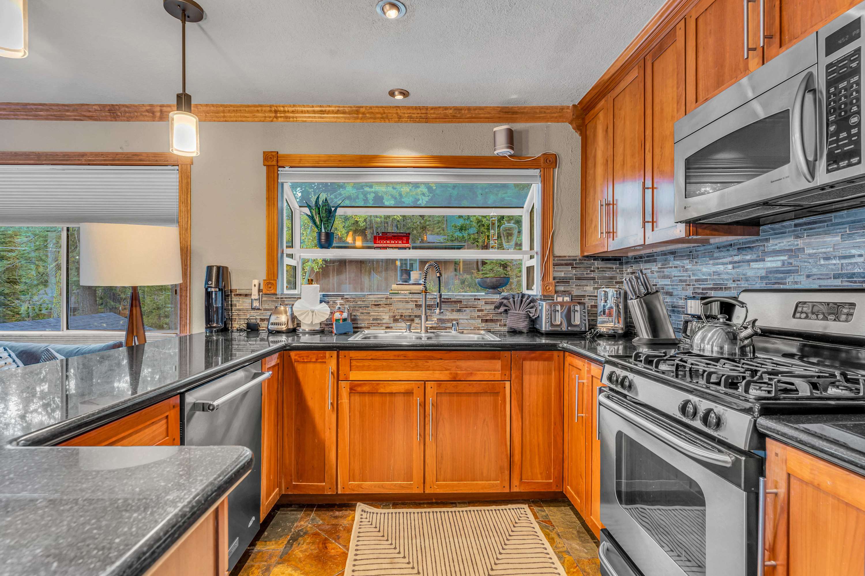 This renovated Tahoe vacation rental combines modern amenities, stylish design, and private outdoor spaces. Inside, a spacious living area with a 65” Smart TV, Sonos sound system, dedicated workspace, and well-equipped kitchen ensures a cozy stay. Outside, relax on the deck or choose from one of 2 fire pits. Just a 10-minute walk to Hurricane Bay Beach and a quick drive to Homewood Resort and Tahoe City, this home offers both convenience and tranquility.