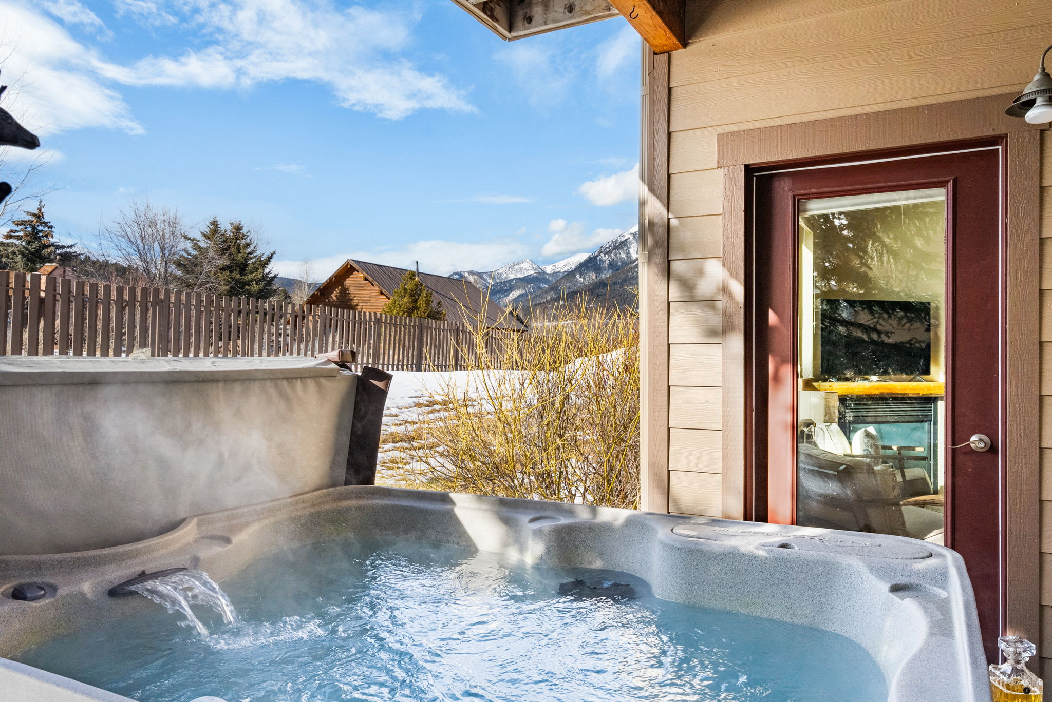 The Space Location perks: Big Sky Village Center (0.3 miles), Free Big Sky Shuttle Stop (0.3 miles), Town Center (0.6 miles), Lone Mountain Trailhead (2.5 miles), Big Sky Resort Base Area (5.8 miles) Interior: — Kitchen (drip coffee maker, Crockpot, blender, kettle, French press, cooking utensils, tableware) — 4 Smart TVs (42"–50”) with streaming — Gas fireplace — In-unit washer and dryer — Free WiFi (3 Rivers Communication, speed not specified) — Electric heat and no A/C — 1,769 sq. ft. Exterior: — 4-person private hot tub — Gas grill (Weber) — Patio — On-site parking for 2 vehicles (1 in 93”H garage, 1 in driveway) Main floor: Kitchen, dining area, living room, half bathroom Upper floor: 1 bedroom (king bed), 1 en-suite bathroom, 2 bedrooms (queen beds), 1 full bathroom