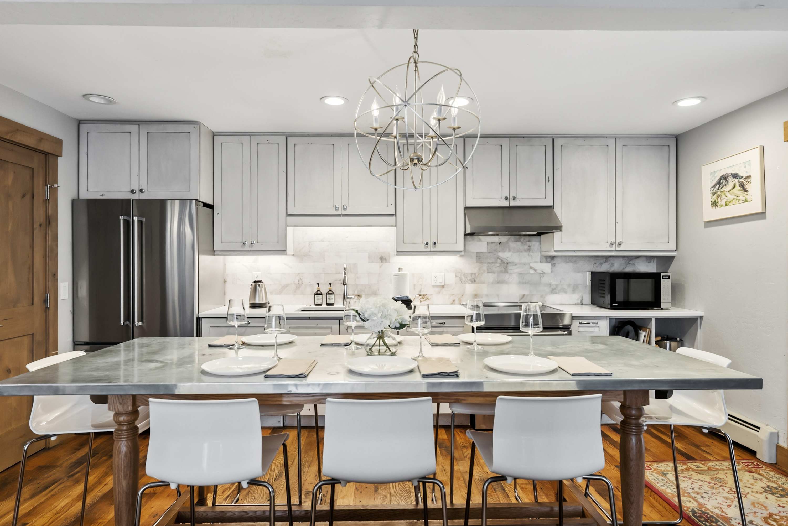 This three bedroom plus loft, three bathroom condo is spacious enough to comfortably accommodate groups of 8. The condo has been completely renovated and is tastefully finished and decorated. The master bathroom has a king bed, mounted TV, a balcony, and an en suite bathroom with a shower. The second guest bedroom has a queen bed and directly across from it is a bathroom with a shower/tub. The third bedroom has two twin XL beds has a bathroom across the hall with a shower. We set the loft to be the fourth bedroom and it has two twin beds. The kitchen and living room share an open space and have an ideal layout for groups to spend time together. The living room has a comfortable sectional sofa, and a large, wall mounted TV. There is access to an outdoor balcony off of the living room. The kitchen is fully stocked with everything needed to prepare a meal and it is very nicely finished with quartz countertops and stainless steel appliances including an induction stove top and dual oven. The dining table is large, custom made with a zinc surface and has seating for 8. The condo also enjoys great amenities for the mountains. There are shared hot tubs and sauna available to guests year round. The condo comes with two parking spaces. Please make sure you display parking permits in your vehicles at all times. Lastly, there is a washer and dryer in the master bedroom that guests can use during their stay. Please note that like most homes in Breckenridge, we do not have A/C. Breckenridge STR License Number: 336510001