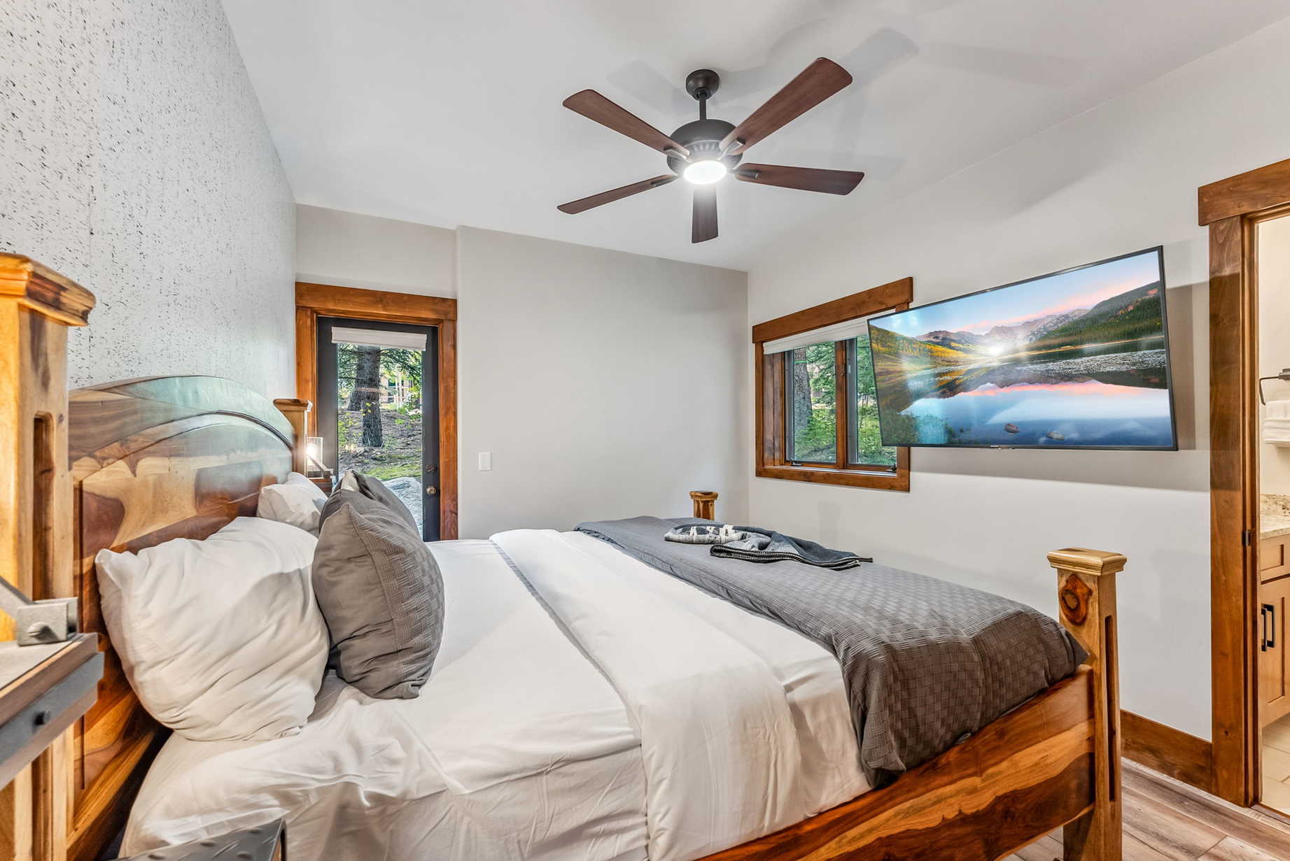 Location perks: Blue River Recreation Path (0.3 miles), BreckConnect Gondola (0.4 miles), Breckenridge Ski Resort (0.5 miles), Main Street Station (0.7 miles), Isak Heartstone Trailhead (1.2 miles) Interior: - Fully equipped kitchen (Keurig coffee machine) - 3 Smart TV’s (57” in living room) - Gas fireplace - Heated bathroom floors - Washer/Dryer - Central heating, no A/C Exterior: - Balcony - On-site parking - On FREE shuttle line - Walk to ski lifts - Access to shared hot tub Upper Floor: Living room, kitchen, dining room, balcony Lower Floor: 2 bedrooms, 1 full bathroom, 1 en-suite bathroom, garage w/laundry Step into this modern, bright split-level home, designed for comfort and relaxation. After climbing 20 steps to the front door, you’ll enter a split-level entryway that leads up to the main living space. The open-concept living area features a large sectional couch, perfect for lounging after a day on the slopes, and a massage chair to ease any lingering tension. Bathed in natural light, the space includes a gas fireplace for a cozy ambiance and a 57” TV with a soundbar for the ultimate movie night. Step onto the balcony to enjoy your morning coffee or evening drink while soaking in peaceful, forested views. The fully equipped kitchen with modern appliances, including a Keurig, makes meal prep a breeze, and the 7-person dining table is ideal for gathering together. Afterward, unwind with a soak in the shared hot tub—a perfect way to end your day of adventure. Head downstairs to find 2 inviting bedrooms, each with outdoor access, ensuring you wake up to crisp mountain air. The primary bedroom features a king smart bed, a 48” TV, and an en-suite bathroom with heated floors and a double-sink vanity. The second bedroom offers a queen bed, a dedicated workspace, and a 38” TV, making it a peaceful retreat. Both rooms have ceiling fans to keep you comfortable in warmer months. With a full bathroom for shared use on the lower floor and a washer/dryer for added convenience in the attached garage, this 950 sqft home is designed for a relaxing stay. The home’s central location puts you steps from the BreckConnect Gondola, Snowflake Lift, and the FREE shuttle line, making it easy to explore all of Breckenridge. Breckenridge STR Permit Number:471550002