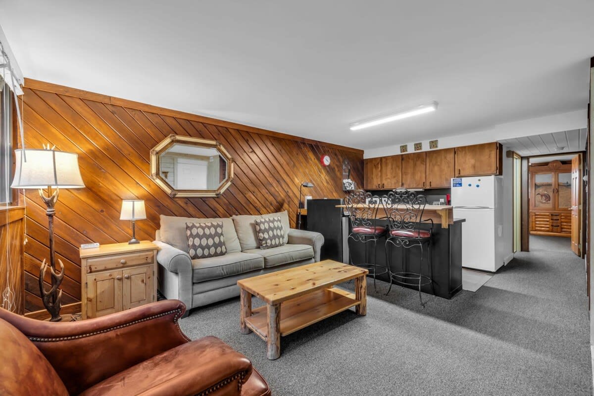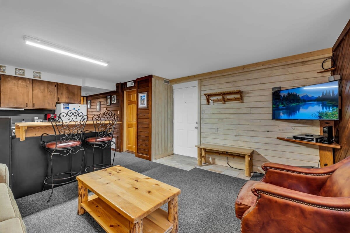 After a fun-filled day of endless mountain adventures, guests will appreciate the rustic feel of this condo that will accommodate up to 2 guests. Relax in the comfortable sofa while snuggling up with warm blankets, as you unwind for the night with a cup of hot cocoa. Watch your favorite movie or show on the flat-screen TV from either the living room or the kitchen. The fully-equipped kitchen has everything you need during your stay and is available for guests to cook a delicious homemade meal. Enjoy your dinner on the kitchen bar with seating for 2, as you reminisce on the exciting adventures during your day out. The bedroom features a comfortable queen-size bed, a TV with a cable package, ample storage space for your clothes, and a full bathroom around the corner with a beautifully designed walk-in steam shower. A laundry room with a washer and dryer combo is available near the front door entrance next to the kitchen. There are free lighted tennis and pickleball courts in the complex, as well as city electric bikes available during your stay. STR Permit Number: B-011133
