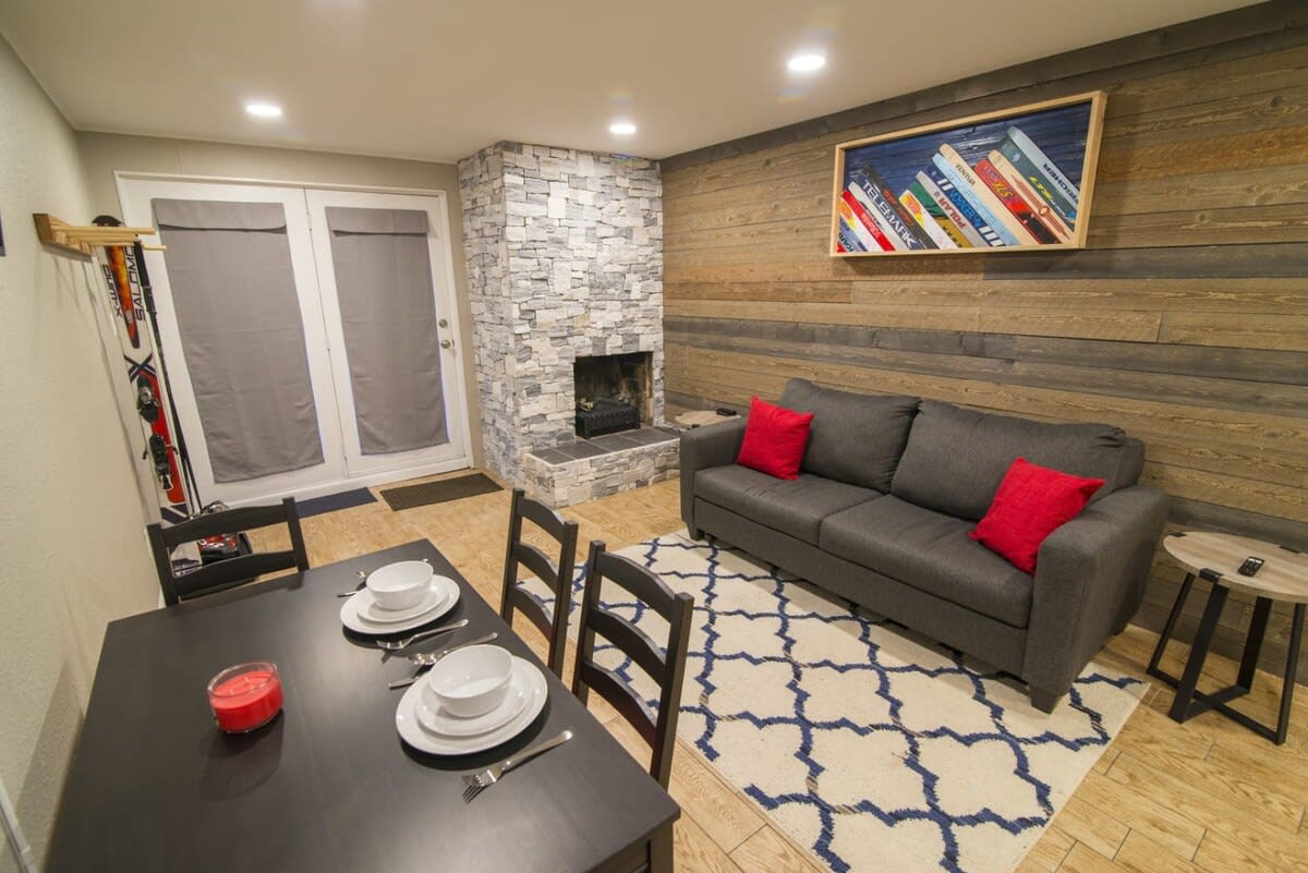 After a fun-filled day on the slopes or exploring downtown Breckenridge, unwind in this cozy one-bedroom, one-bathroom apartment that can accommodate up to 4 guests. This apartment is in an unbeatable location, making it the perfect home base for those looking to explore all Breckenridge has to offer! As you enter the apartment, you will be greeted by charming small details such as exposed brick, unique accent walls of rustic wood panels, and a statement stone fireplace. Enter the apartment into the open-space living/dining/kitchen area where you will find all the necessities for a comfortable stay. The front part of the apartment is dedicated to the living and dining room, creating a dynamic space for relaxing, eating, or having a game night. In the living room area, you will find a stone electric fireplace with floor-to-ceiling stone creating a lovely statement piece in the home. Relax on the comfortable couch that can be converted into a queen-size pullout. Spend time cuddled up by the fire, or watching a movie on the 32” TV mounted on the wall across from the couch above the dining table. Across the room is the dining area where you will find a table with seating for four and beautiful updated built-in cabinets with additional counter space creating extra room for food storage or meal prep. The kitchen area of the home is just off the living/dining space and is equipped as a kitchenette for preparing simple meals at home. In the kitchen, you will find ample cabinet space for storage in the beautiful cabinets, and basic cookware to make some of your meals at home. In addition, the kitchen boasts a wine/beverage-fridge, microwave, toaster, coffee machine, and stovetop. Please note, the space does not have an oven. Located off the right of the kitchen is the full bathroom, which features a single-sink vanity with under-sink storage space, a medicine cabinet above the sink, a toilet, and a tiled bath/shower combo. To the left of the kitchen, you will find the bedroom with a queen-size bed, two nightstands with lamps, and a large closet space with a dresser inside. The bedroom has a modern cabin vibe, creating the perfect cozy atmosphere for a restful night of sleep. STR License Number:412020002