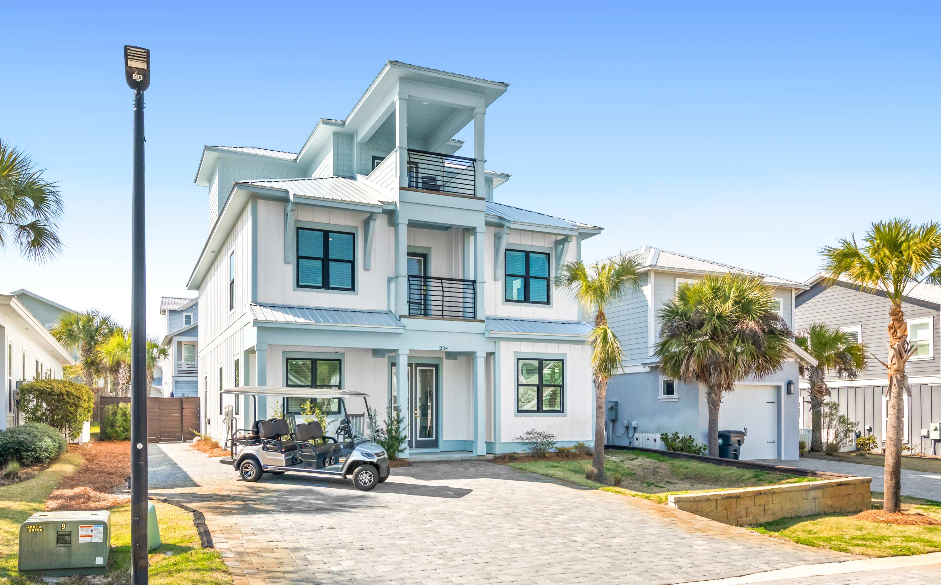 While the beach is within walking distance, a car is recommended to fully experience the luxury shopping, golf courses, and neighboring coastal towns along 30A. The property features a large private driveway with space for up to 5 vehicles. For those looking to explore without driving, local ride-share services are readily available to transport you to nearby Destin or the Village of Baytowne Wharf.