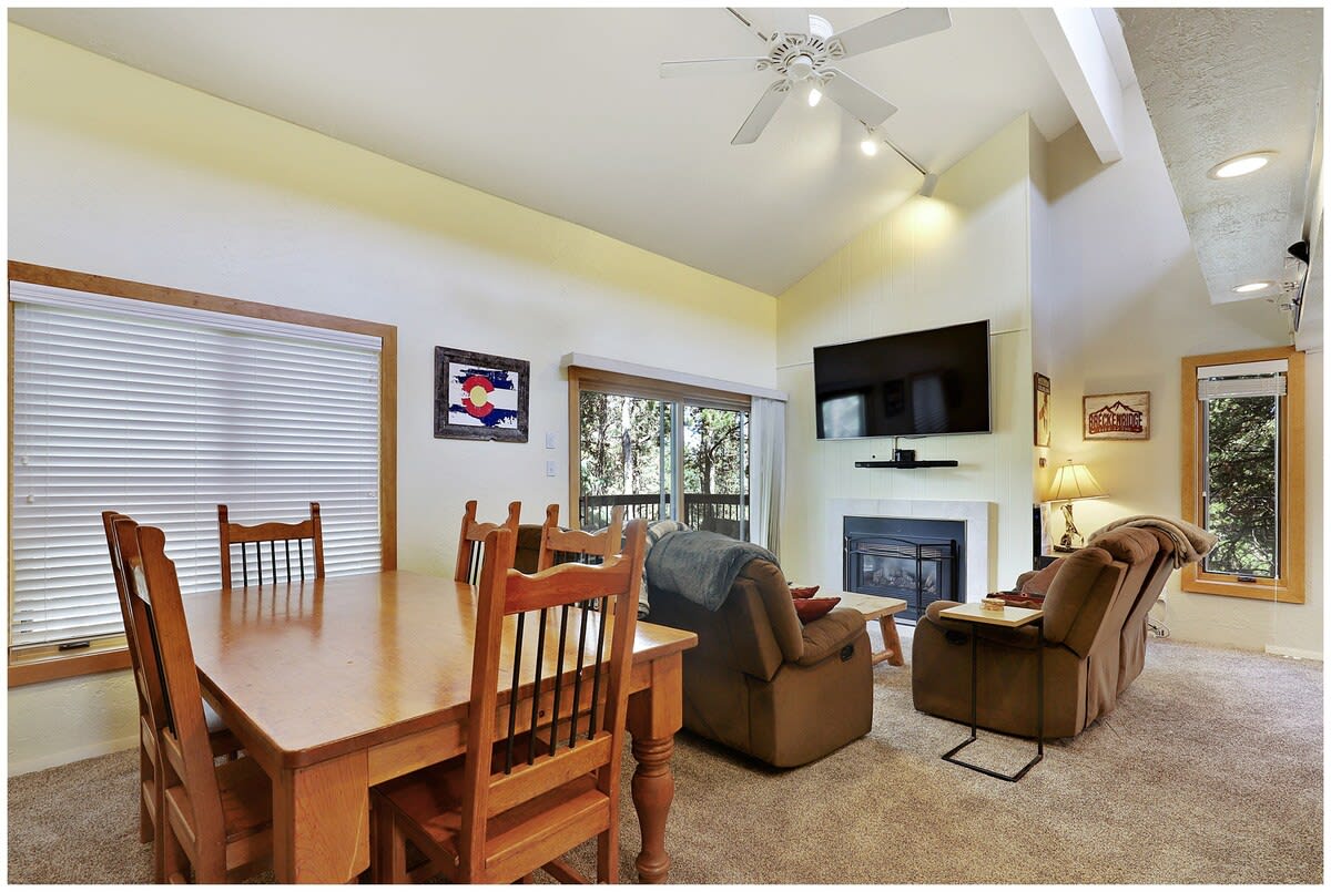 This 2 bedroom + loft, 2 bathroom condo can accommodate up to 8 guests. The primary bedroom has a king bed, a gas fireplace, and flat screen TV that is mounted. The second bedroom has a queen bed and a flat screen TV. Both of the bathrooms have a walk-in shower. There is no bathtub in the condo. The loft is located above the living room and has two twin beds and two full beds. The loft is minimally decorated and simplistic. It is outfitted with multiple beds for guests to sleep and very little else. The kitchen and living room make up the rest of the living space in the condo. The kitchen is fully stocked with everything a chef needs to prepare a meal with plenty of counter top space and stainless steel appliances. The dining table has seating for 6 and is located just off of the living room. The living room is a great space for your group to relax with comfortable furniture, a gas fireplace, and a large flat screen TV. There is a small patio off of the living room with a gas grill and outdoor furniture. Also, there is a mudroom at the entrance of the condo that can be used to store all of your winter and summer gear. The amenities included with the condo are very nice. There is one outdoor parking space and shared laundry in the condo building. Access to the slopes is easy with the Quicksilver lift, a short 8 minute walk away on a shoveled and paved path. Additionally, the Breck Free ride bus stops right across the street ((at the entrance of Base 9 Condos) and can take you to the gondola and other peak bases. Lastly, guests will have access to the newly renovated Columbine Pool and Hot Tubs. Please note that like most homes in Breckenridge, we do not have A/C. Breckenridge STR License Number:467850002