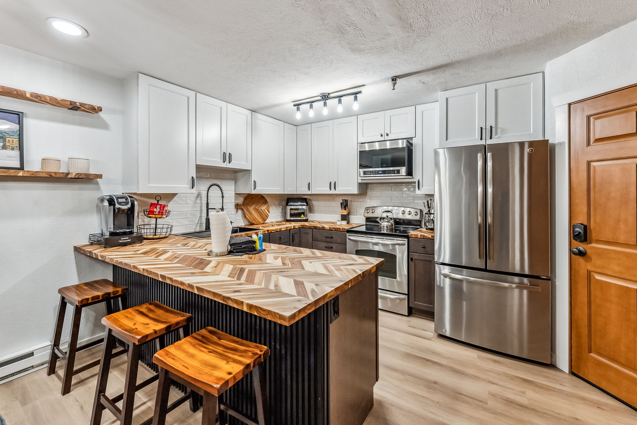 The unbeatable location of this condo ensures that all of Breck is at your doorstep! Walk across the street to enjoy all the restaurants and shops of the quintessential ski village. The closest access point is the base of Peak 9 and the Quicksilver Chair, at 0.4 miles away, it’s a flat-elevation, 5-minute walk. The Snowflake Lift is very close for Peak 8 Access, a slight uphill for 0.4 mile, 9-minute walk. The Gondola is also easy to access, a flat-elevation, 0.7-mile walk. The BreckConnect Gondola is always free, runs summer and winter, and brings you to the base of Peaks 7 and 8. It’s also a great ADA-accessible option for people with limited mobility or non-skiers. To get back home after a day on the mountain, ski or hike down Four O'Clock Run. At the bottom of the hill, turn right onto the sidewalk, pass through the roundabout with pedestrian crossing, and turn right onto the Cimarron complex.