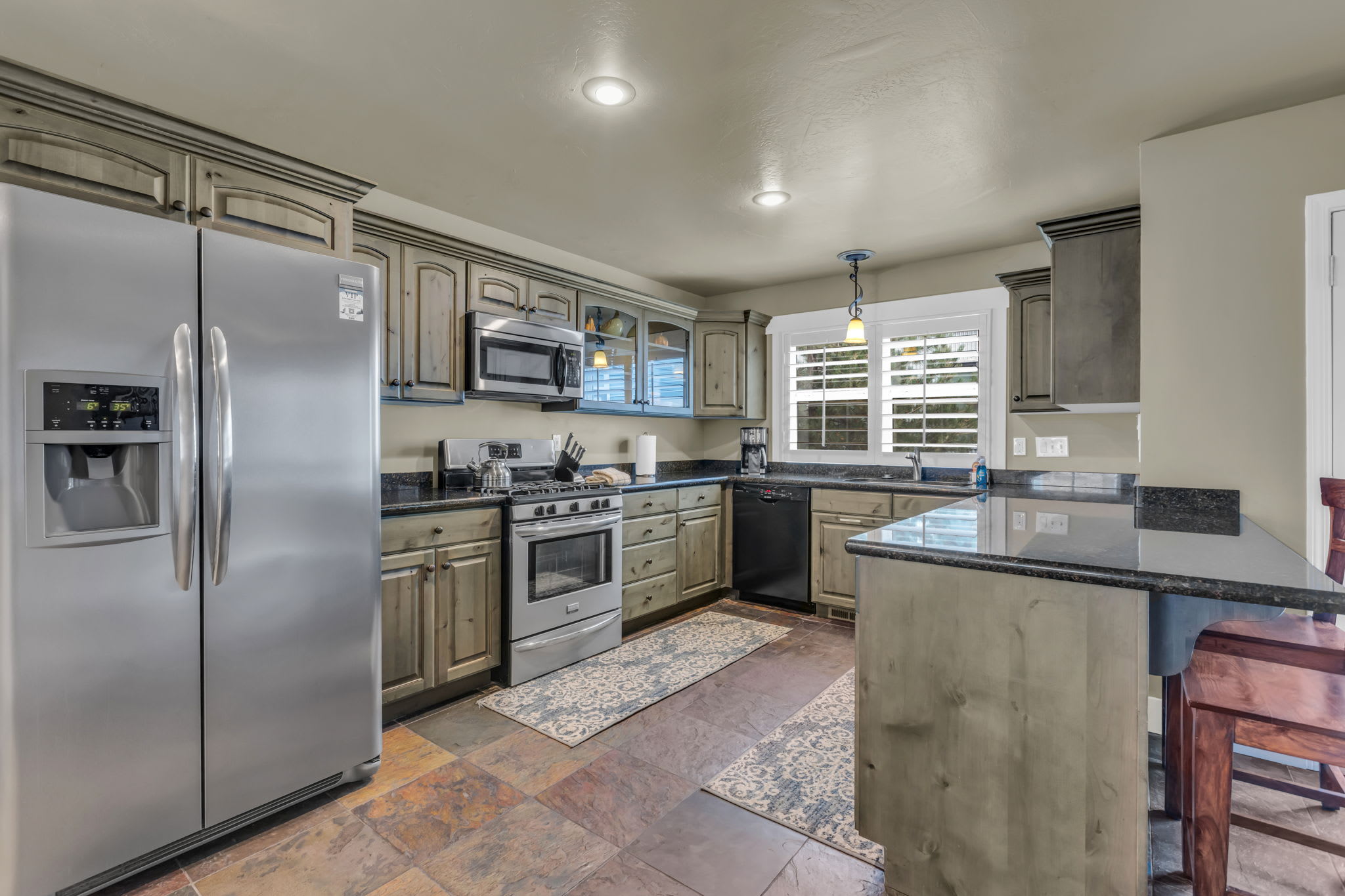 There are 16 steps leading up to the front door. The garage accommodates vehicles under 194” in length and has a height clearance of 6’11.5”. Please ensure your vehicle meets these dimensions if you plan to park in the garage. Please keep in mind that if you plan to ski, you are responsible for verifying the ski resorts' opening and closing dates.