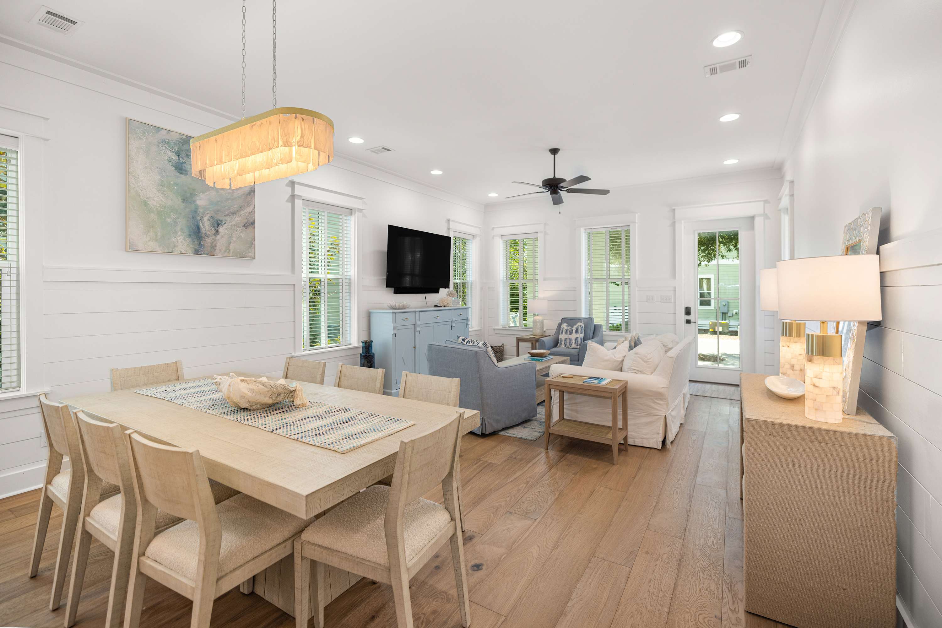 The Space Location perks: Scenic 30A bike path (0.1 miles), Greenway Park Pool (0.2 miles), Seagrove Beach (2.2 miles), Seaside Town Center (3.0 miles), Publix at WaterColor Crossings (3.0 miles) Interior: — Kitchen (drip coffee maker, Keurig, air fryer, blender, cooking utensils, tableware) — 6 Smart TVs (up to 75”) with Roku — Samsung soundbar (living room) — Central heat and A/C — Free WiFi — 2,342 sq. ft. Exterior: — Patio — Gas grill — On-site parking for 2 cars (driveway only, no garage access) Floor Configuration Main floor: Kitchen, dining area, living room, 1 bedroom (king bed), 1 en-suite bathroom, half bathroom Second floor: 3 bedrooms with 3 king beds, an additional living space including 2 sets of twin bunk beds (no door or closet in this room), 2 full bathrooms - 1 is a en suite with bedroom 2 and the other is a jack and jill attaching bedrooms 3 and 4.
