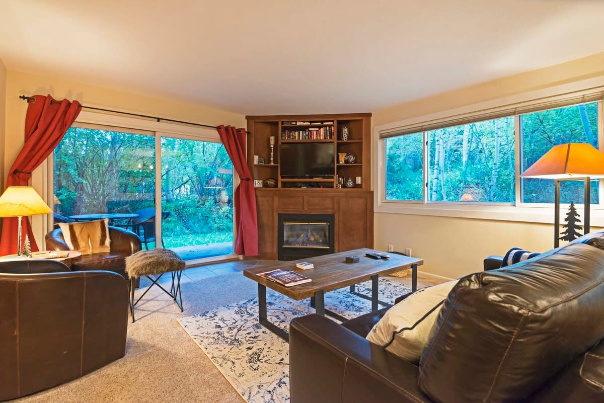 This 2 bedroom, 2 bathroom condo is the perfect choice for families that want to experience mountain adventures at their fingertips. After a fun-filled day of endless outdoor adventures, stretch out and relax in the family room that features a leather sofa with matching armchair seating. Cozy up with your loved ones as you turn on the indoor gas fireplace and feel the warmth permeate throughout the room. Unwind for the night as you watch your favorite movie or show on the flat-screen TV. The chef in your group will appreciate the fully-equipped kitchen with modern stainless steel appliances, where you can whip up a scrumptious homemade meal for your group. Keep the cook company with the 3 breakfast bar stools in the kitchen. Enjoy your dinner, as you exchange stories of your exciting day, in the lovely dining area. The outdoor patio will amaze you with its gorgeous scenery and tree views -- step out, relax, and breathe in the fresh mountain air as you gaze at the beautiful glow of the sunset. With this condo a true ski-in/out, you can quickly grab your ski gear, and head right out the door for some fun on the slopes, during the winter months. For a night of peaceful rest, the master bedroom features a lovely king-size bed, a flat-screen TV, and an en suite bathroom with a jetted spa tub and shower combo. The second bedroom has a comfortable queen-size bed, a twin over twin bunk bed, and a flat-screen TV. There is a shared full-bathroom, around the corner, that features a jetted spa tub and shower combo. For an even more relaxing experience, guests can make their way to the shared hot tub in the complex, where you can enjoy a tranquil and warm space. A community pool is also available in the complex. A laundry room with a washer/dryer combo is located next to the refrigerator in the kitchen. STR Permit Number: B-018393