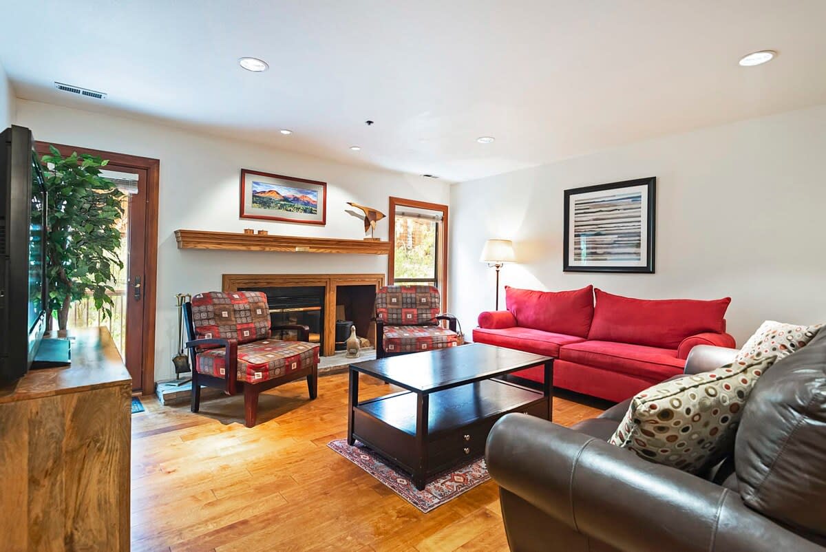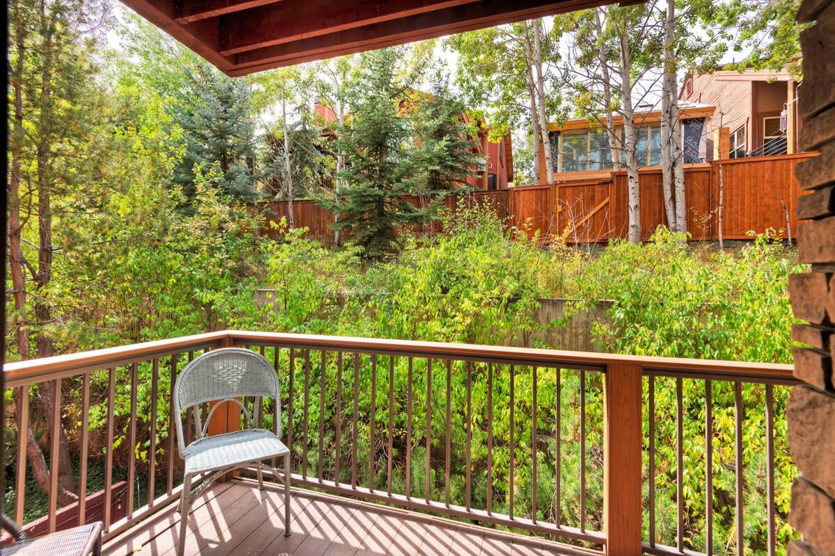Ideal for those seeking a perfectly-situated hub for exploring all that Park City has to offer, this charming 2-bedroom, 2-bathroom home that sleeps seven provides ample space and comfort for your endless Park City adventures. Located just one block from the base of Park City Mountain Resort, you can spend your day in the mountains hiking shredding powder or shooting down the Alpine Slide and then return home to this inviting space to kick back and relax by the fire while you recount your epic outings. From the moment you enter, your comfort and convenience is top of mind with a bench, laundry facilities and hooks for your outdoor gear and a spacious, full-size bathroom with a double sink vanity should you need to wash up sooner than later. A useful shower/tub combo completes the bathroom, which is both attached to a bedroom and is just off of the main hallway/common spaces. Make your way to the roomy kitchen/living/dining area where you will find a stately wood table with seating for six that is ideal for digging into a meal or playing a favorite game. The nearby kitchen space is bright and beautiful with white finishes, stainless steel appliances and a bar space with seating for four that makes for easy serving or dining from the kitchen. Even as you whip up a delicious recipe or grab a snack, you are central to the fun in the neighboring living and dining areas, making it easy to stay central to it all even as you craft your latest culinary creation. The cozy living area centers around a wood-burning fireplace flanked by nature views that make for easy ambience. A leather couch, sofa, two armchairs, coffee table and media center with a flat-screen TV complete the space, making for an inviting place to unwind with your loved ones as you warm up by the fire or take in a show on the 50" Vizio Smart TV. The sofa pulls double duty as a sleep space, pulling out into a queen-size pull out bed when you’re ready to tuck in for a night of rest. A patio just off of the living area has seating for three and is a lovely place to take in some fresh, mountain air or the beauty of Park City. You can also access this beautiful outdoor space from the master bedroom, located just off of the living room. The lovely master bedroom boasts a king-size bed, cozy armchair, flat-screen TV and DVD player and an ensuite bathroom in addition to its patio access making for a restful retreat when you’re ready to drift off to sleep. The ensuite bathroom features a double sink vanity, closet space and a tiled, walk-in shower. The airy second bedroom makes the most of its space with a twin-over-queen size bunk bed that comfortably sleeps three, a cozy armchair where you can relax and unwind and a TV with cable access. Attached to the full-size bathroom off of the hallway, this room also connects to the dining area making for easy access when you’re ready for bed. In addition to its ideal location and comfortable furnishings, the home also comes with access to a community hot tub for your enjoyment and use. STR Permit Number: B-018392