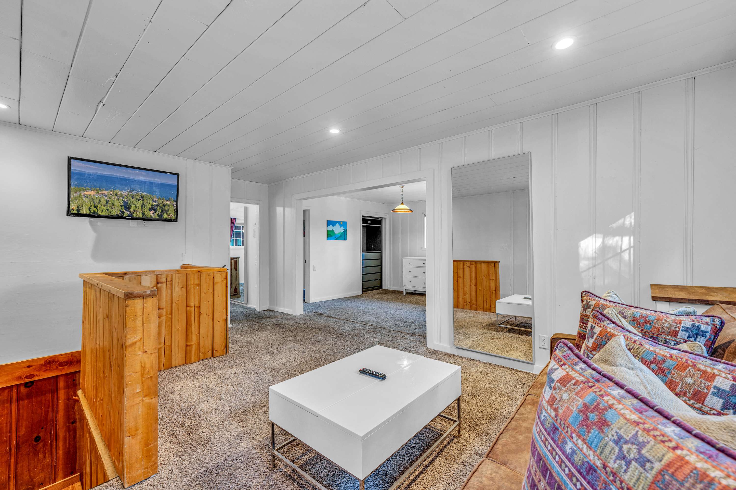 Location perks: Tahoe City Marina (0.4 miles), Save Mart (0.6 miles), Commons Beach (0.6 miles), Tahoe Cross-Country Ski Area (3 miles), Palisades Tahoe (7.8 miles) Floor configuration: Main floor: Kitchen, dining area, living room, 2 bedrooms (each with queen bed and desk), 1 full bathroom (vanity in hallway) Upper floor: 2 bedrooms (each with king bed—1 with Smart TV, 1 with adjustable desk/monitor), 1 full bathroom, second living area Interior: — Kitchen (drip coffee maker, Crockpot, air fryer, waffle maker, cooking utensils, tableware) — Smart TV (50”) with Roku — Wood-burning fireplace (wood not provided) — 2 living rooms (one with L-shaped sectional, one with couch + coffee table) — In-unit washer and dryer — Free WiFi (157 Mbps) — Central heat and no A/C — 1,942 sq. ft. Exterior: — Gas grill (Available only during the summer months) — Fenced backyard with patio — New composite deck — On-site parking for 4 cars in driveway (garage space not guest accessible) STR Permit Number: STR25-9497 Max Occupancy: 8 Parking Info: On-site parking for 4 cars in driveway (garage space not guest accessible)