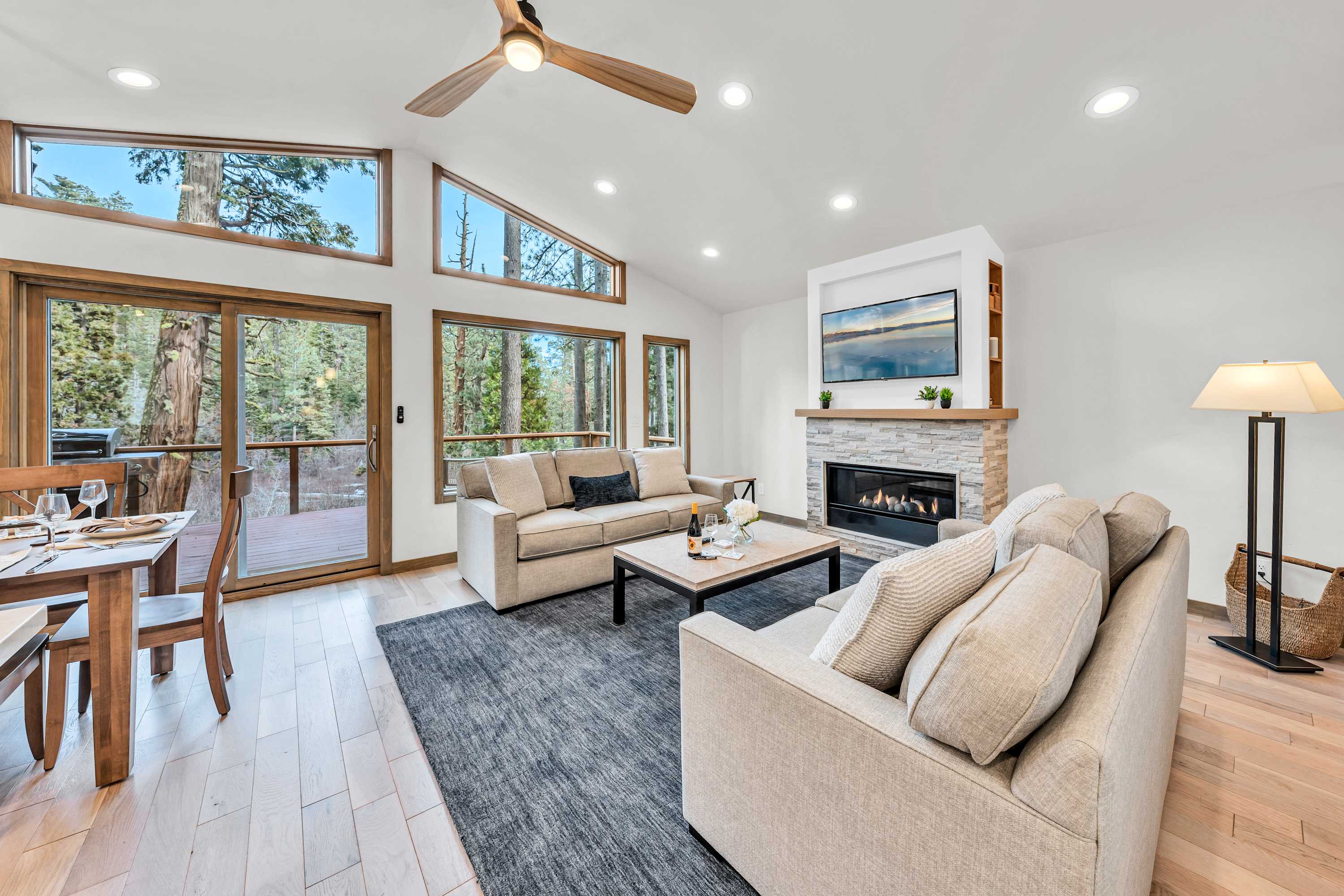 The space Location perks: Lake Forest Beach (2.0 miles), Tahoe City (2.0 miles), Commons Beach (3.0 miles), Alpine Base Area at Palisades Tahoe (8.0 miles), Northstar California Resort (16.0 miles) Interior: — Kitchen (drip coffee maker, toaster, blender, kettle, cooking utensils, tableware) — 50” Smart TV with Firestick — Gas fireplace (2-way in primary bedroom and en-suite) — Sonos sound system — In-unit washer and dryer — Free WiFi (23 Mbps) — Central heat and no A/C — 1,455 sq. ft. Exterior: — Private 6-person hot tub — Gas grill (on upper deck) (Available during the summer months) — Deck with outdoor dining (6-person patio set) — Primary balcony overlooking hot tub and creek — On-site parking for 3 cars (1 in garage, 2 in driveway) Floor configuration: Main floor: Kitchen, dining area, living room, 2 bedrooms (king bed with en-suite; queen bed), 2 full bathrooms Upper floor: 1 bedroom (queen bed), 1 en-suite bathroom (also accessible from upstairs common area)