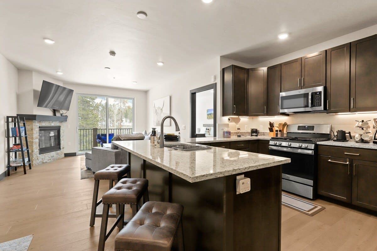 As you enter the condo you will be greeted by a stylish light-filled space with beautiful wood floors, an open layout, and views out toward the surrounding trees. Directly to the left of the front door, you will find the kitchen which features a nook space with a built-in bench and coat hooks providing a convenient space to unload your outdoor gear before settling in. The chef in your group will love cooking in this beautiful kitchen! From the spacious granite countertops and lovely cabinets to the stainless steel appliances, the kitchen will have everything you need to put together a delicious meal. A kitchen bar with three bar stools connects the kitchen to the dining area where you will find a wood table with seating for six, an oversized rug, and artwork warming up the space. Next to the kitchen/dining area, you will find the well-decorated living room, an inviting and cozy common area perfect for relaxing. Warm up by the lovely stone gas fireplace as you settle into the cushy chair or comfortable sofa, which doubles as a pull-out queen bed. Enjoy the views out the patio door as you catch a movie on the 60” TV and make plans for your next adventure. From the living room, you can step out of the sliding patio door and take in the fresh mountain air and lovely views. When you are ready to settle in for the night, you will find two bedrooms that will make you feel right at home. Just off the living room, you will find the beautiful and spacious master bedroom. Rest up in the comfortable king-size bed where you will find two nightstands with lamps, or watch a movie in bed from the 50” TV. Bring your morning coffee and enjoy the gorgeous nature views from the large windows in the room as you prepare for a day of fun. Rounding out the room is a large dresser and closet to store your personal belongings and an attached bathroom. The master bathroom is a gorgeous space with light tile floors, a large double-sink vanity, and an oversized walk-in shower with a small built-in tile bench. Providing a great separation of space, you will find the home’s second bedroom on the other side of the condo. The guest bedroom is located just off the dining room and is a great space for families traveling with children as it has a bunk bed with a twin-over-queen bed in the room and a large closet. Kids will love staying on the top bunk while parents get the spacious queen-size bed. The room even has a 40” TV, so you can have a family movie night from bed to unwind after a busy day. Right next to the guest bedroom is the shared full bathroom which features fun ski-themed artwork, a single-sink vanity with under-the-sink cabinet space, and a bathtub/shower combo, so you can easily bathe little ones before tucking in for the night. Keep up with any laundry needs while on vacation with the in-unit stacked washer and dryer located just off the right of the front door. The condo also features access to a shared hot tub located on-site, making it easy to soak sore muscles after a day on the slopes. Permit #: STR23-R-00055