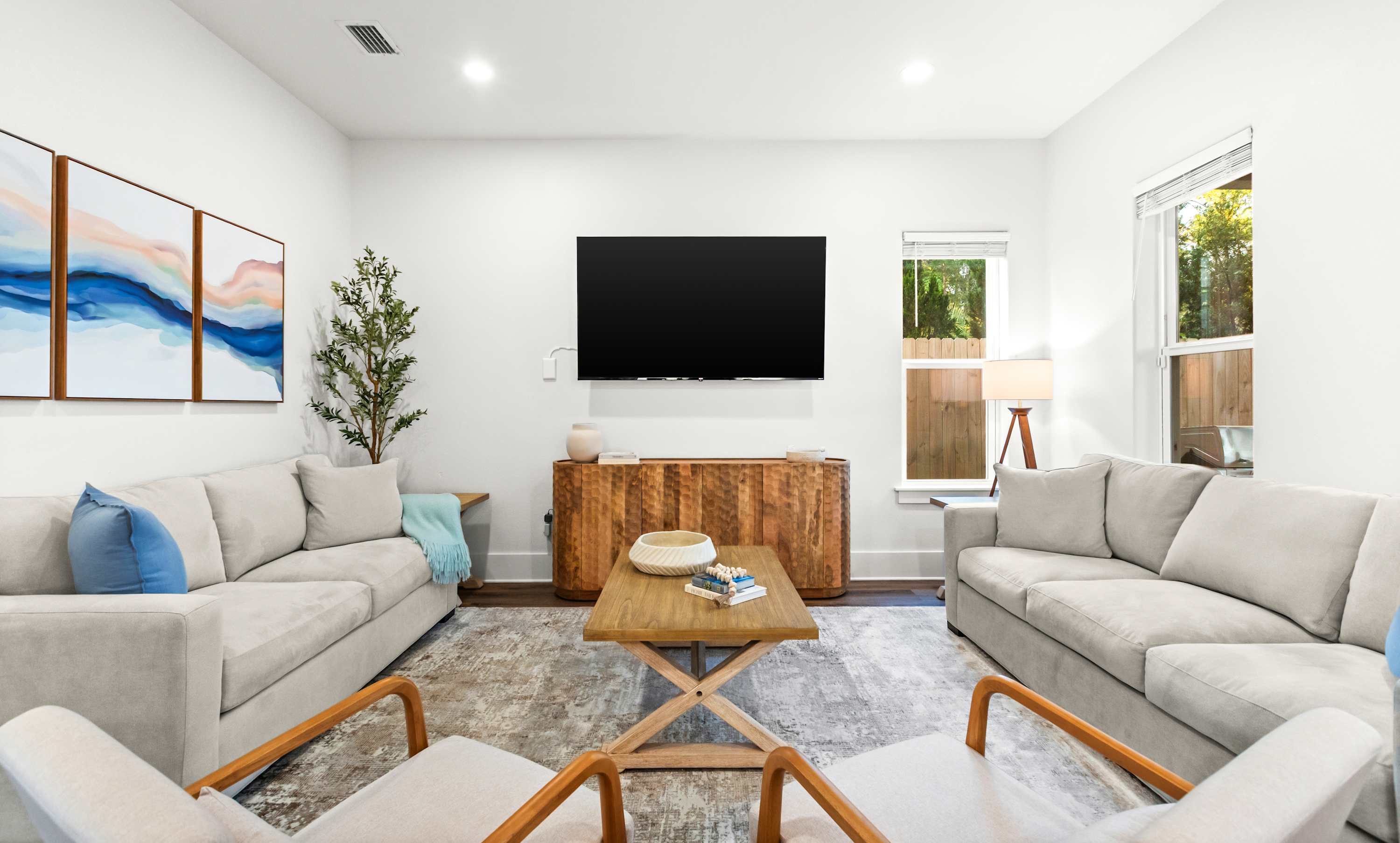 Location perks: — Frangista Beach (0.5 miles) — Silver Sands Premium Outlets (2 miles) — Sandestin Golf and Beach Resort (3 miles) — Destin Commons (4 miles) Interior: — Fully equipped kitchen (drip coffee maker, Keurig, toaster oven, Crockpot, blender, cooking utensils, tableware) — 6 Smart TVs (75", 65", 55", 50", and two 32") — Retro arcade games — Dedicated workspace — In-unit washer and dryer — Free WiFi (500+ Mbps) — Central heating and A/C — 2,360 sq. ft. Exterior: — Gas grill — Private backyard — Patio — Shared Pool — 6-passenger golf cart — Beach supplies — On-site parking for 4 cars (4 in driveway) Floor Configuration Main floor: Kitchen, dining area, living room, 1 bedroom (king bed), 1 full bathroom Upper floor: 1 bedroom (king bed), 1 en-suite bathroom, 1 bedroom (king bed), 1 en-suite bathroom, 1 bedroom (3 full beds and 3 twin beds), 1 en-suite bathroom, bonus room