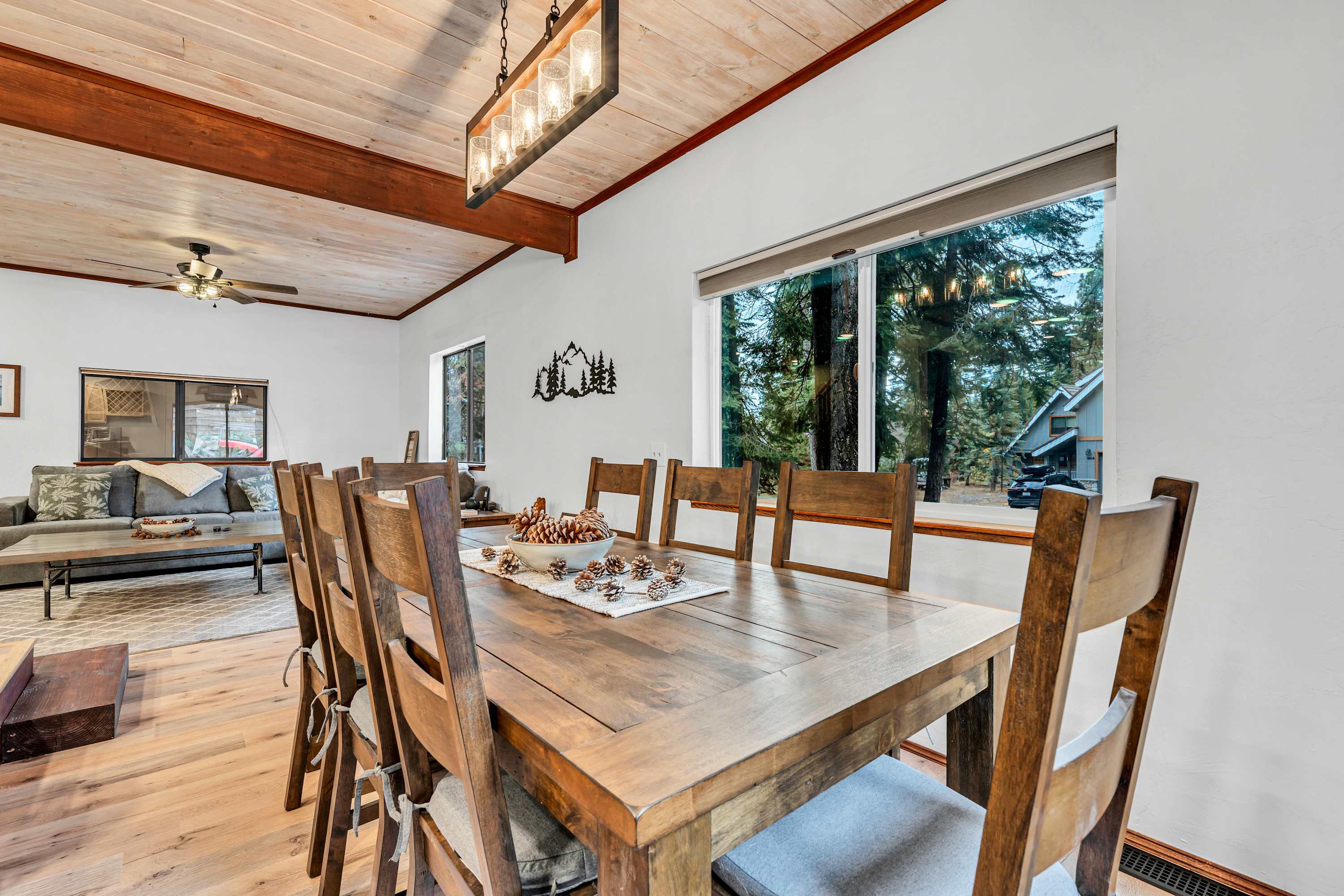 Location perks: Sunnyside Restaurant & Lodge (0.7 miles), Hurricane Bay Beach (1.6 miles), Tahoe City (3.2 miles), Commons Beach (3.4 miles), Palisades Tahoe (9.7 miles) Floor Configuration Main floor: Kitchen, dining area, living room, 1 bedroom (king bed), 1 en-suite bathroom, 1 shared bathroom (steam shower) Upper floor: 2 bedrooms (1 with king bed, 1 with queen bed + 2 twin beds), 1 full bathroom Interior: — Kitchen (drip coffee maker, French press, Crockpot, blender, kettle, waffle maker, cooking utensils, tableware) — Private indoor hot tub — Smart TV (65”) with streaming — Washer & dryer — Central heat and no A/C — Free WiFi (423 Mbps) — 1,953 sq. ft. Exterior: — Electric grill (Available during the summer months) — Balcony — On-site parking for 2 cars (driveway) STR License #: STR25-9581